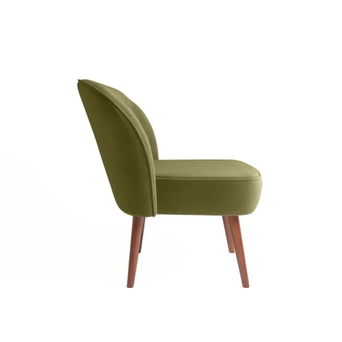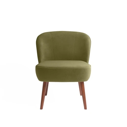 Ce petit fauteuil chic et design est un rendez-vous réussi entre le velours, le bois, deux matériaux nobles et prestigieux, et la couleur kaki, naturelle, profonde et douce. Il apporte un coup de charme à la fois authentique et plein de personnalité à votre décor. Le fauteuil de cocktail en velours Jane peut trôner au salon, dans une chambre ou une véranda. Il se glisse volontiers dans un ensemble qui mélange les influences à la façon du style bohème, avec un pouf Tina beige, des coussins à motif animaux, un miroir vintage en bois foncé.