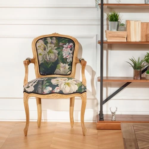 Caractéristiques du Fauteuil Cabriolet Louvre GraphiteStructure en hévéa massif, légèrement cérusé. Couleur bois légèrement cérusé et lin. Assise et dossier rembourrés en tissu imprimé fleuri en lin. Finition double passepoil en velours de coton noir.Fauteuil de style Louis XV, revisité avec un tissu haute couture en 100% LIN sur l’assise et le dossier.Fauteuil au dossier cintré et pieds galbés, ornés de moulures. Fleurette sculptée à la main sur le haut du dossier et au centre de la ceinture. Dimensions du Fauteuil Cabriolet Louvre Graphite :Largeur : 60 cm Profondeur : 62 cm Hauteur : 95,5 cm Poids : 9 kgLivraison chez vous : uniquement en pas de porte (devant votre porte d’habitation)Attention, veuillez vérifier que les ouvertures (portes, escaliers, ascenseurs) permettront le passage du/des colis lors de la livraison.Dimensions et poids du colis :L 66 X H 103 X P 68 cm13 kg